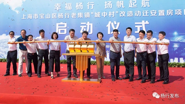 8月1日上午,宝山区杨行镇老集镇“城中村”改造动迁安置房项目启动仪式在位于宝杨路、松兰路口的项目地块内隆重举行。市房管局领导冷玉英、区领导汪泓、李萍、丁大恒、周志军、袁罡、王益群、黄辉,镇领导邵雷明、陈江、魏银发以及项目公司负责人出席仪式并共同推动象征启动的推杆。